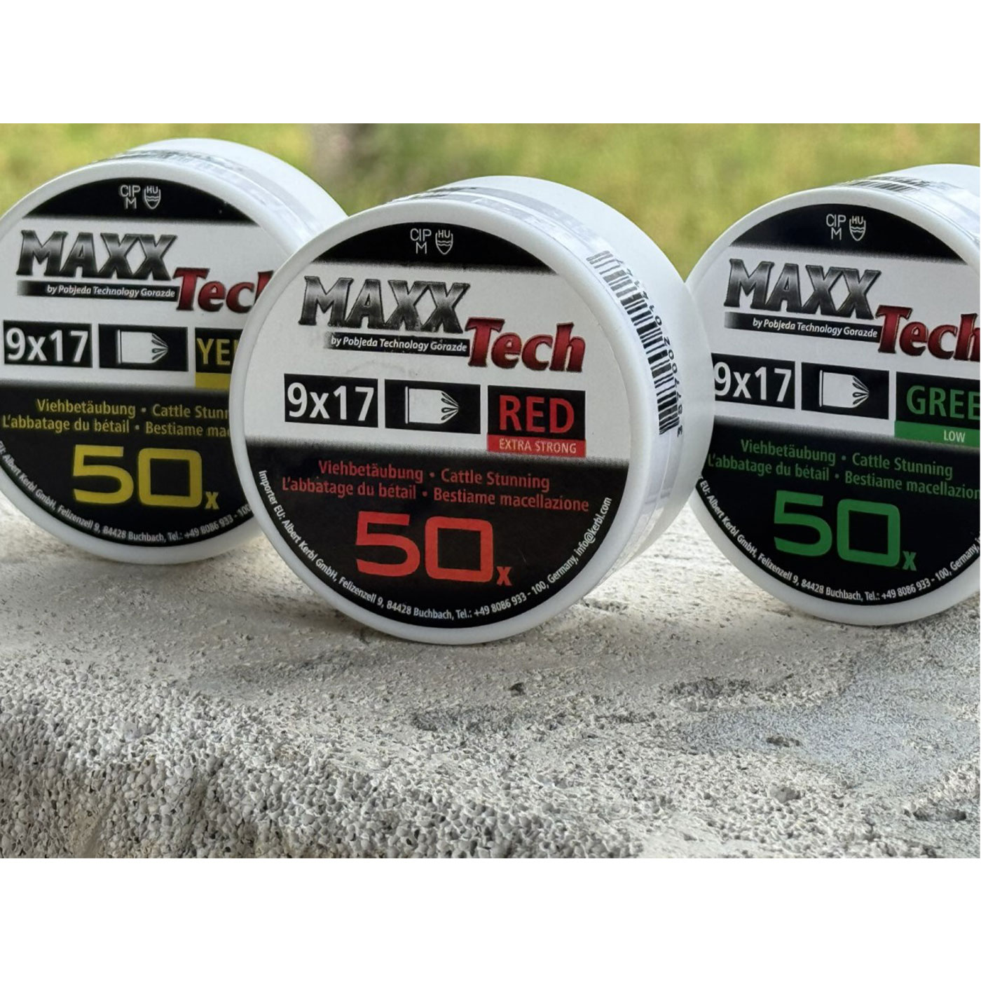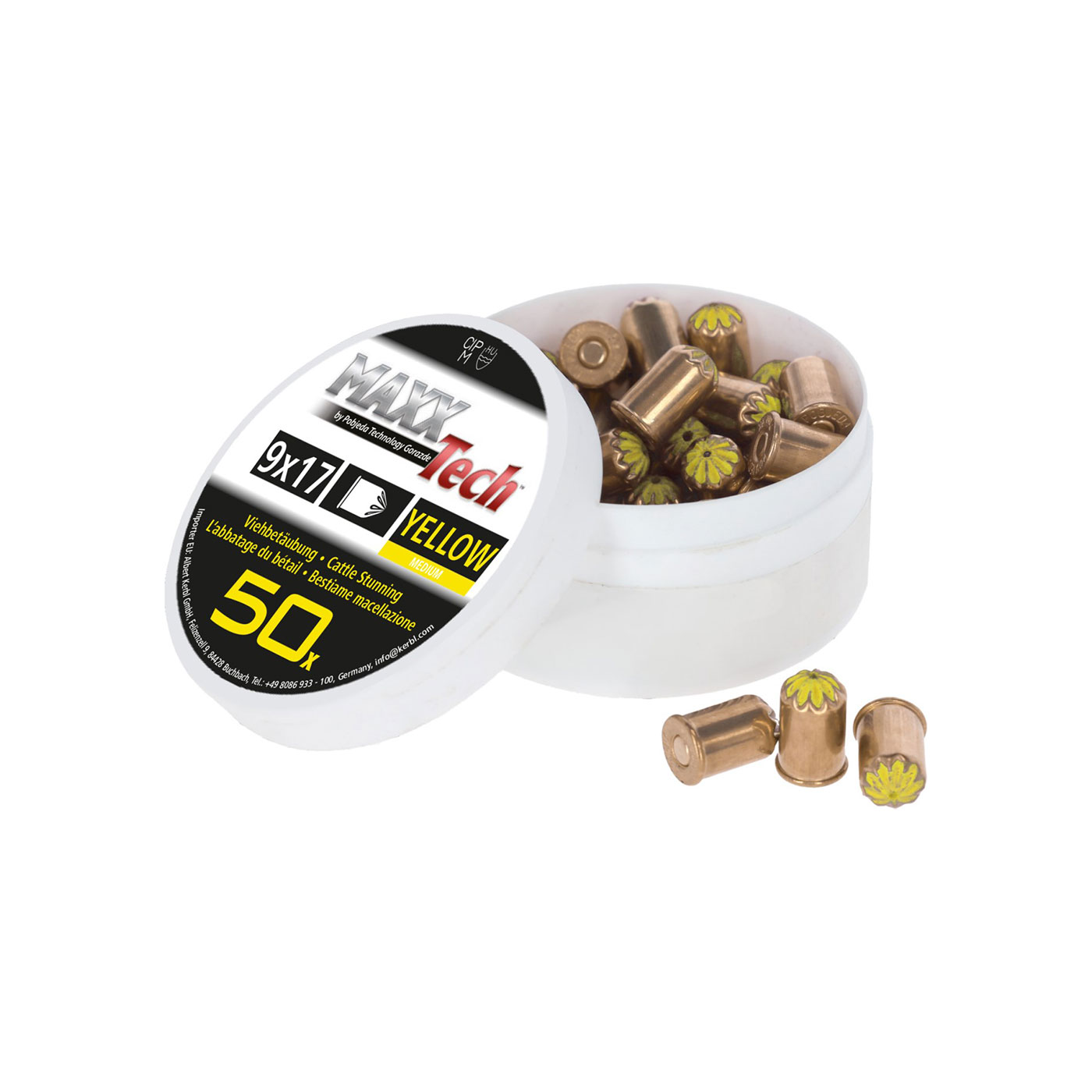 Humanes und effizientes Betäuben von Tieren mit 9 mm Zentralfeuer-Kartuschen von MAXXtech für Schussapparate, 50 Stück pro Dose, CIP-zertifiziert, optimal für Bolzenschussapparate und Wühlmaus-Selbstschussgeräte.
