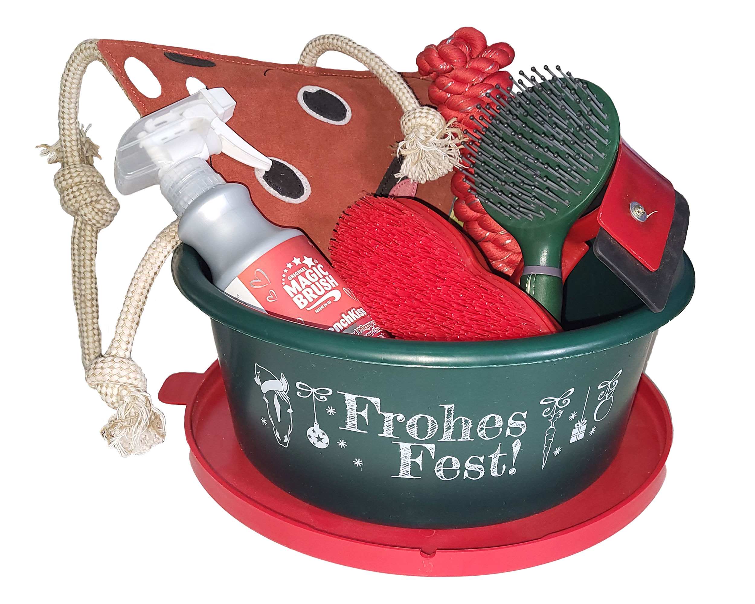 Verpackt ist alles in einer hochwertigen grünen Futterschüssel mit Rotem Deckel mit dem Aufdruck „Frohes Fest!“ – ideal als besonderes Geschenk für Tierliebhaber oder als festliche Überraschung im Stall, Zuhause oder im Verein.