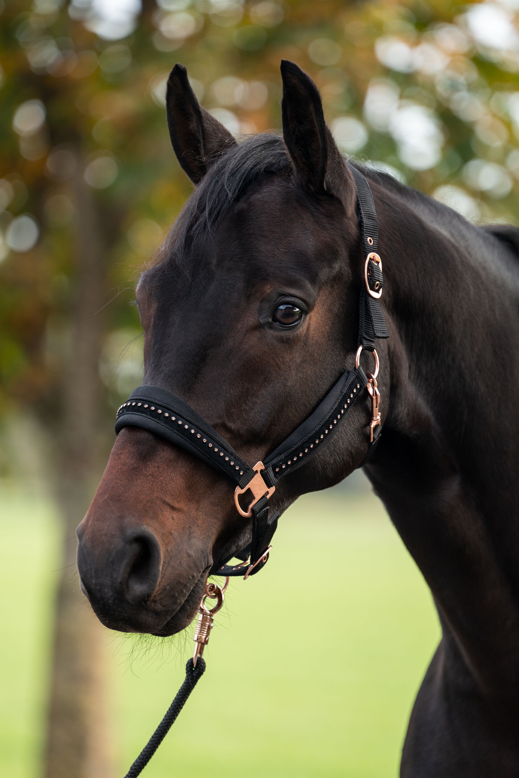 Das Halfter Berry verfügt über ein gepolstertes Nasen- und Genickstück und stabile, silberfarbene Beschläge. Nasen- und Genickstück sind zudem in der Länge verstellbar, sodass sich das Halfter in der Größe anpassen lässt. Die Strasssteine an Nasenriemen und Backenstücken machen das Halfter zum trendigen It-Piece. Selbstverständlich gibt es zu dem Halfter einen passenden Führstrick, der separat erhältlich ist.