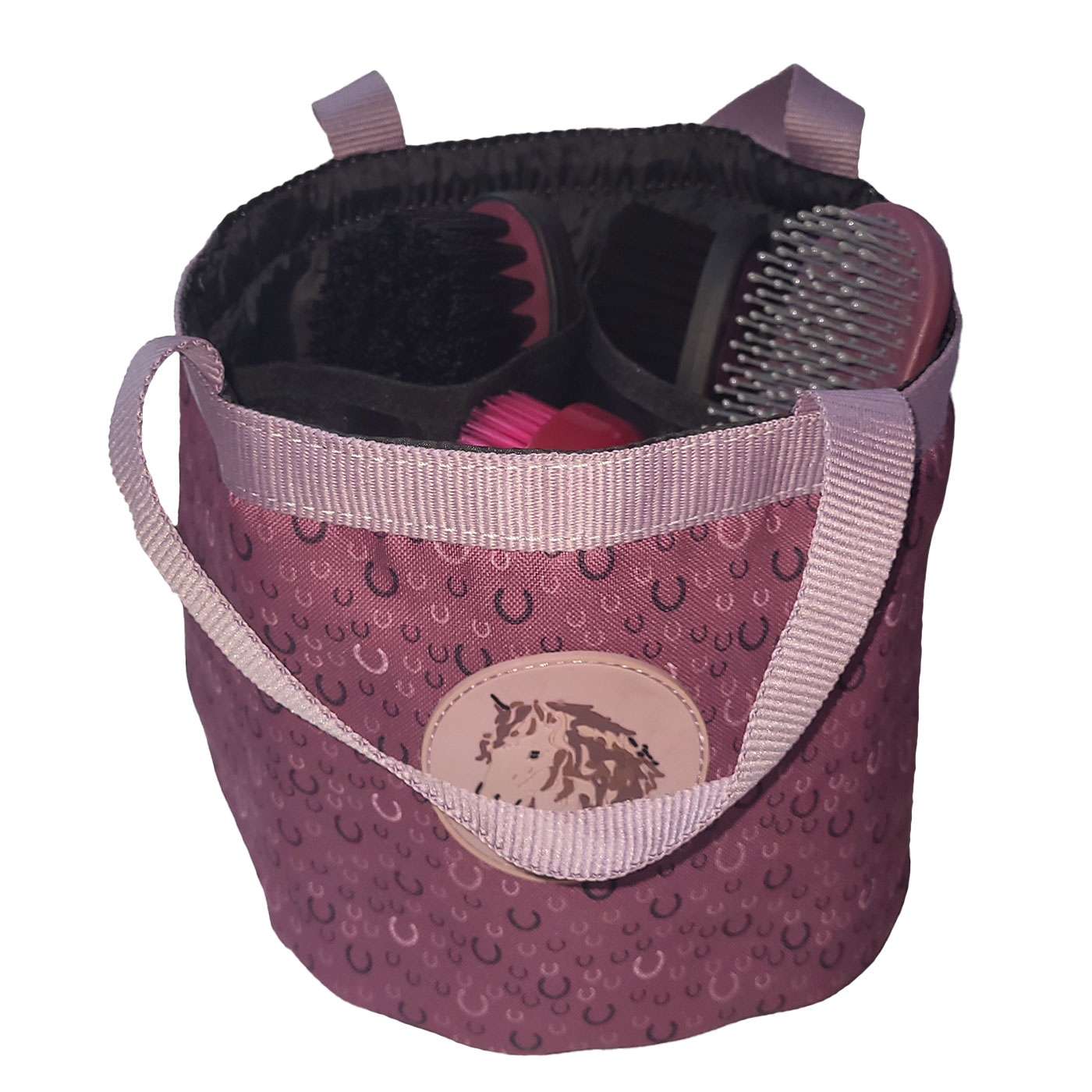 Mit der neuen Putztasche Alva in Lila/Bordeaux mit Hufeisenmuster und süßer Applikation vereint dieses Set Ordnung, Qualität und modernes Design – ideal für Reiter:innen und junge Pferdefreund:innen.