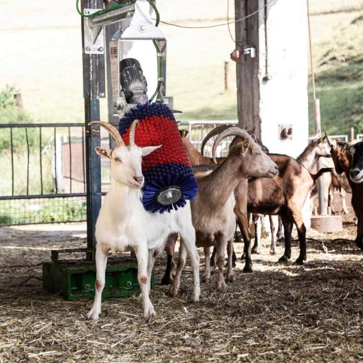 Die Bürste HAPPYCOW MiniSwing dreht sich in jede Richtung und erreicht fast jeden Winkel. Durch die vertikal pendelnden Bürsten wird annähernd jede Körperstelle erreicht, besonders der Kopf und der Rumpf werden gründlich gereinigt. HAPPYCOW MiniSwing ist für Kälber ab 3 Monaten und ausgewachsene Ziegen beeignet. Für max. 40 Kälber bzw. max. 60 Ziegen ist eine Bürste konzipiert.