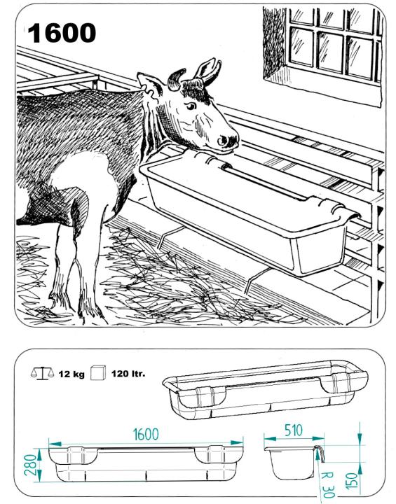 Der Trog hat eine Füllkapazität von 120 Litern und eine Länge von 160 cm, und ist bestens geeignet für Milchaustauscher, Kraftfutter und Wasser. Der grosse Inhalt des Troges reduziert Futterverlust, weil die Tiere weniger Futter aus dem Trog schieben.
