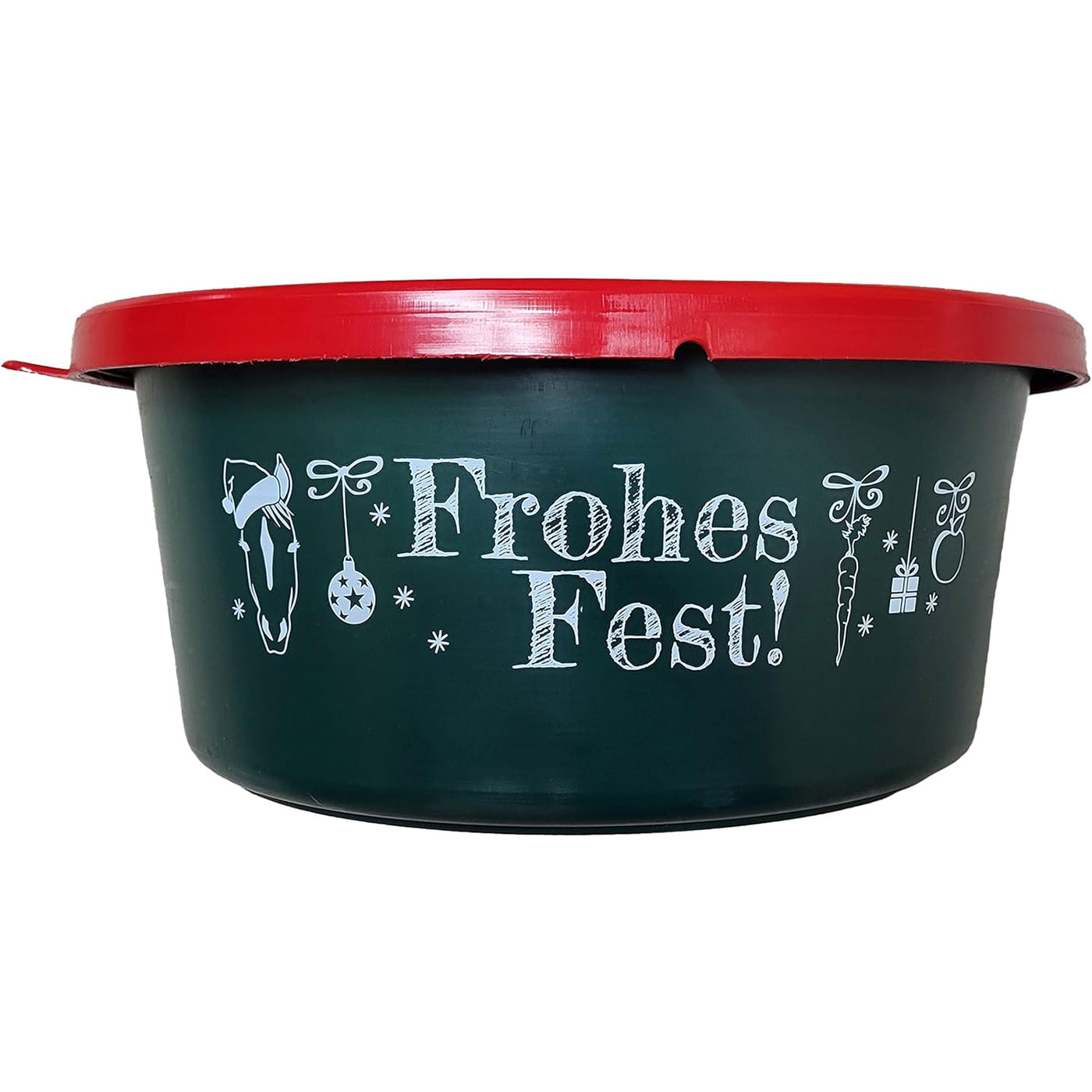 Verpackt ist alles in einer hochwertigen grünen Futterschüssel mit rotem Deckel und dem festlichen Aufdruck „Frohes Fest!“ – ideal als besonderes Geschenk für Tierliebhaber oder als festliche Überraschung im Stall, Zuhause oder im Verein.