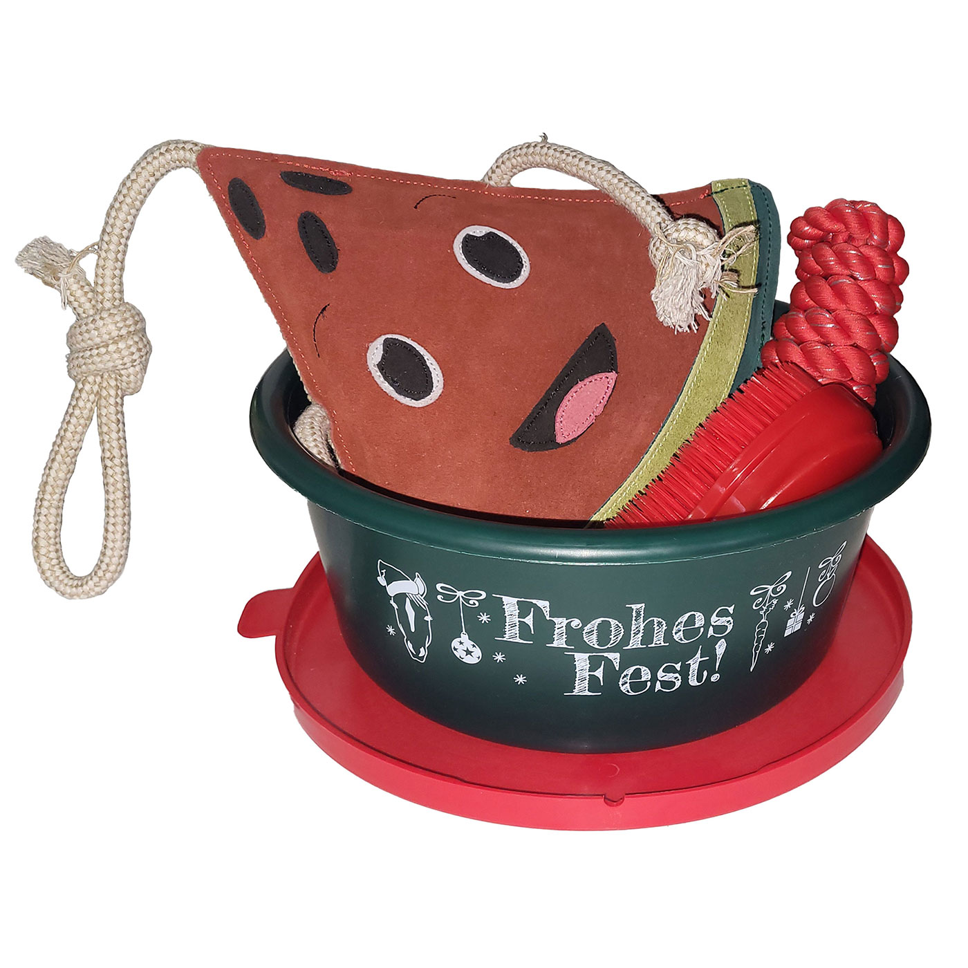 Mit der Mini Festliche Fruchtfreude verschenkst du nicht nur festliche Stimmung, sondern auch praktischen Mehrwert für Stall & Pflegealltag. Dieses liebevoll zusammengestellte Set bringt Spiel, Pflege und Weihnachtsfreude im kompakten Format.