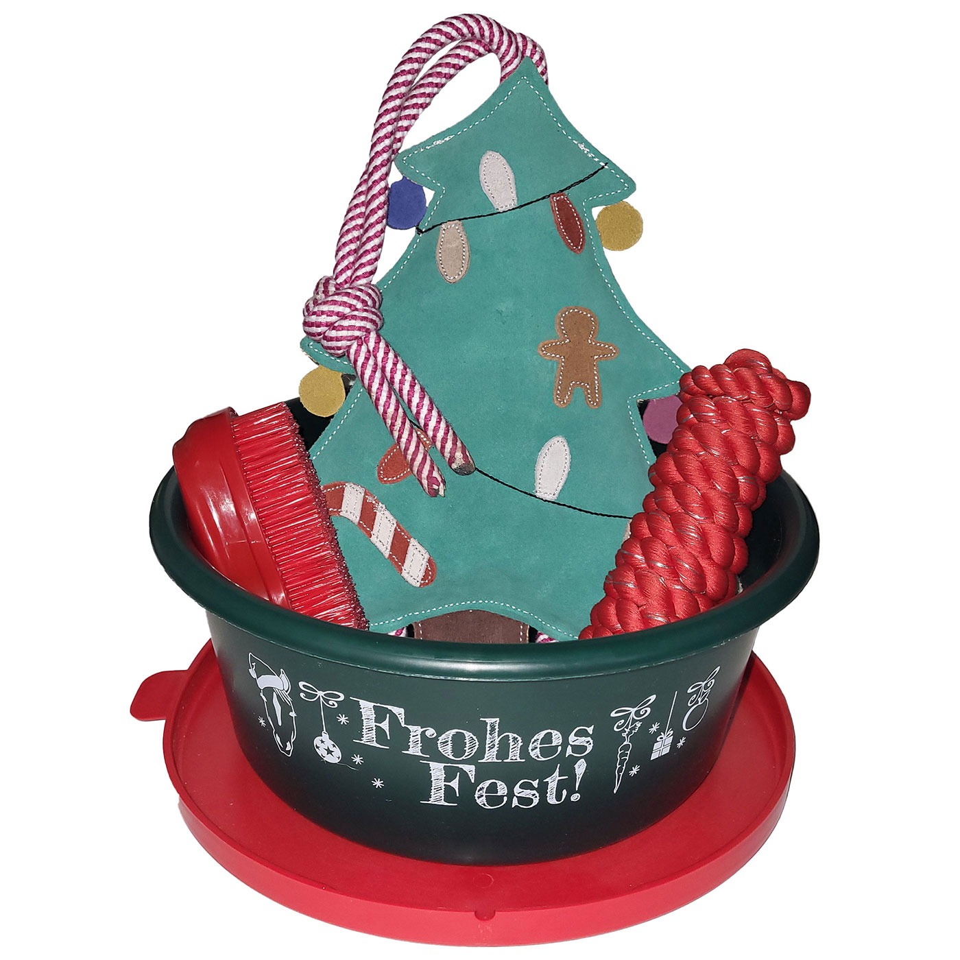 Verpackt ist alles in einer hochwertigen grünen Futterschüssel mit rotem Deckel und dem festlichen Aufdruck „Frohes Fest!“ – ideal als besonderes Geschenk für Tierliebhaber oder als festliche Überraschung im Stall, Zuhause oder im Verein.