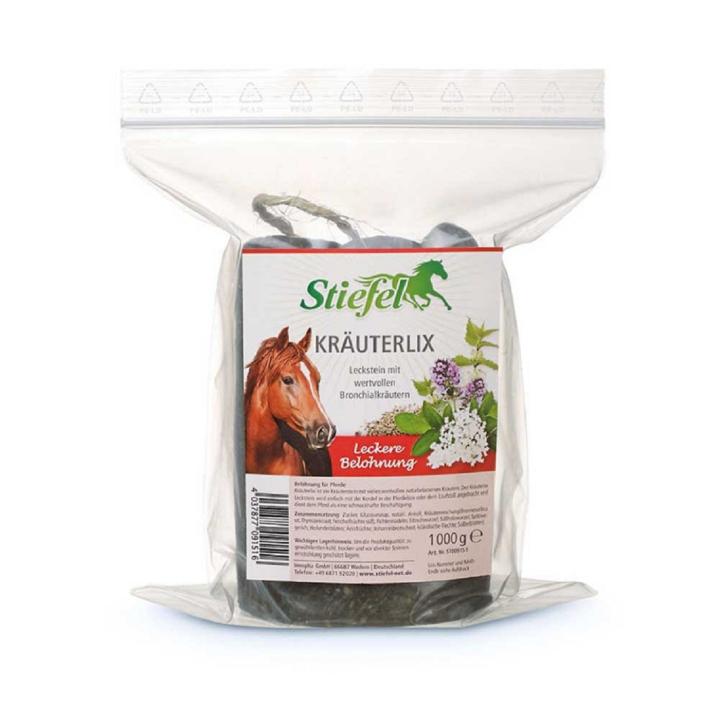 Stiefel Kräuterlix Leckstein ist ein Kräuterstein aus einer Bronchialkräuter-Mischung zur schmackhaften Beschäftigung des Pferdes. Der Kräuterlix Leckstein wird mit einer Kordel geliefert, sodass der Leckstein freischwiegend in der Box oder auf dem Paddock aufgehangen werden kann.