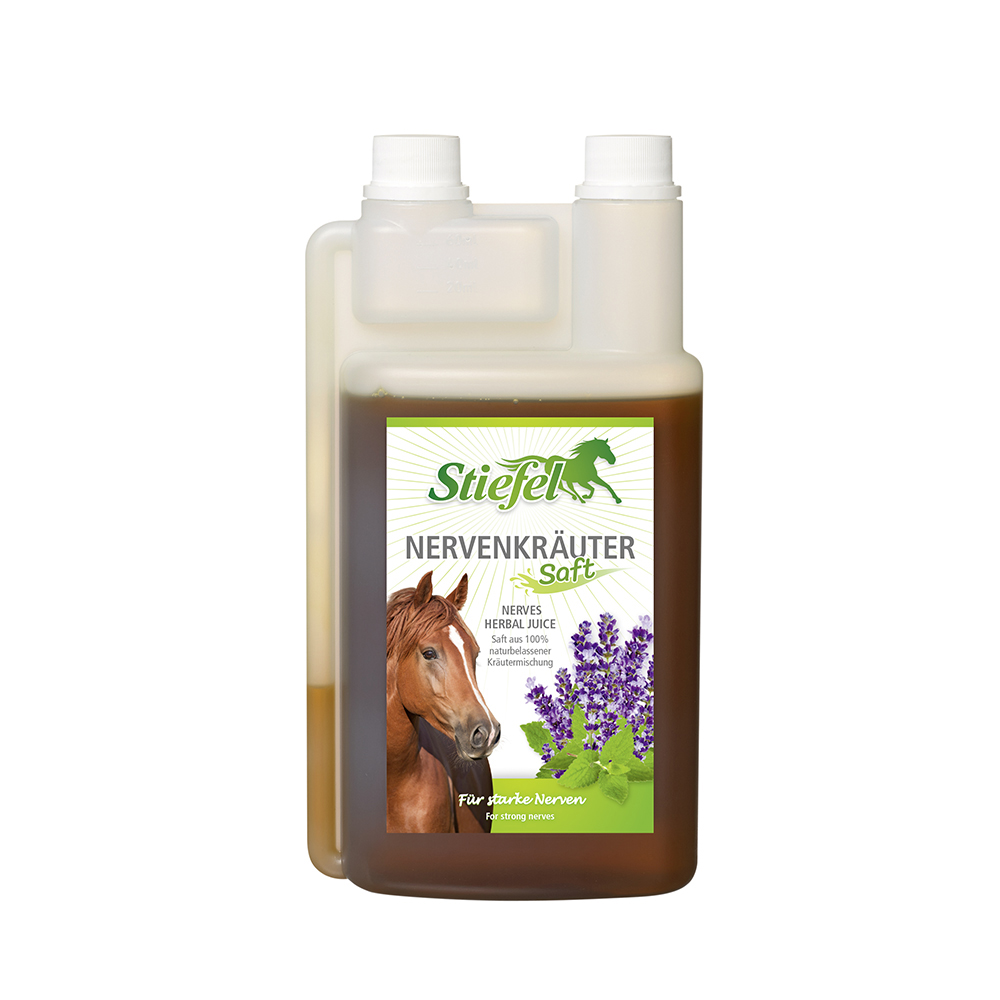 Stiefel Nervenkräutersaft ist ein Saft aus einer speziell ausgewählten Kräutermischung ohne künstliche Aromastoffe zur Unterstützung der Nerven in stressigen oder aufregenden Situationen. Stiefel Nervenkräutersaft kann stressige Situationen entschärfen und bei generell nervösen, schnell gestressten oder gereizten Pferde Abhilfe schaffen. Den enthaltenen Kräutern wird eine beruhigende Wirkung auf das Nervensystem nachgesagt. Lavendel und Kamille können zudem einen positiven Effekt auf den Magen haben, da dieser in Stresssituationen häufig ebenfalls in Mitleidenschaft gezogen wird und verkrampft. Die Fütterung des Stiefel Nervenkräutersafts sollte über einen längeren Zeitraum erfolgen, damit sich die volle Wirkung der Kräuter entfalten kann. Zudem ermöglicht die flüssige Darreichungsform eine hohe Bioverfügbarkeit, sodass die Inhaltsstoffe direkt optimal vom Körper verwertet werden können, ohne vorher umgewandelt werden zu müssen.