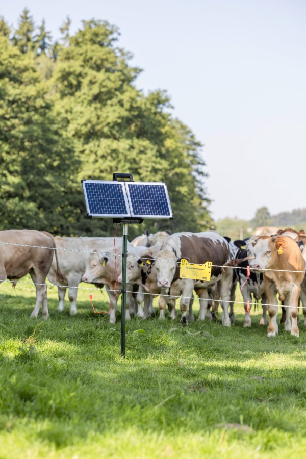 Der mitgelieferte 12 V Akku und das noch unmontierte 30 W Solarmodul ermöglichen zusammen mit dem intelligenten Akkumanagement und der stromsparenden Schaltung einen wartungsfreien Dauerbetrieb über die Hauptweidesaison.
